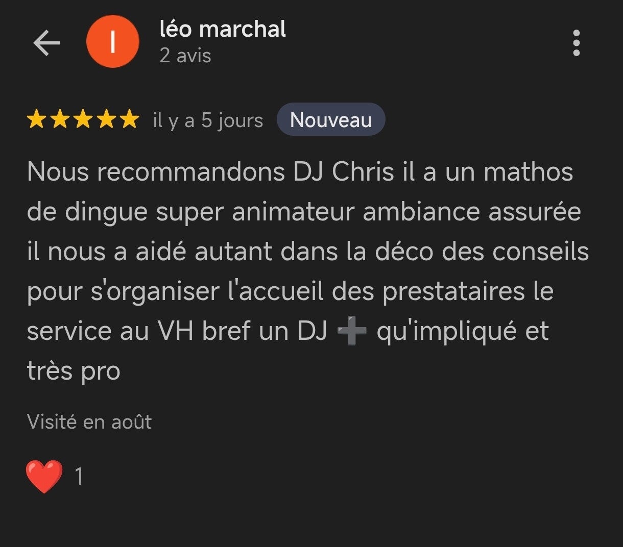 Un grand merci à Chris excellent DJ à notre mariage, pour son professionnalisme, son aide et ses conseils. Nous le recommandons sincèrement Merci à bientôt pour d'autres occasions.. les mariés